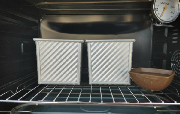 12.三個一組放入吐司盒,在烤箱內發酵,設置38度,放一碗熱水。