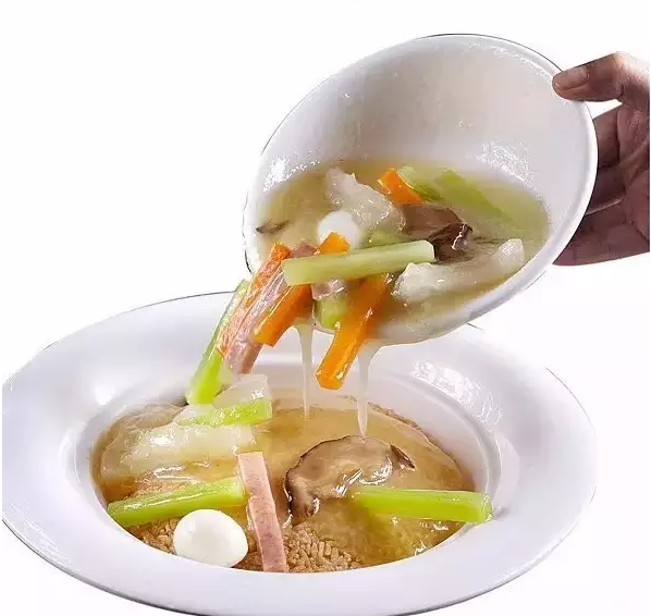 把鍋巴放熱油鍋里炸酥脆,與燴好的蹄筋一起上桌。當(dāng)著客人面把燒好的蹄筋倒在鍋巴上面,在聽到“吱吱”的聲響后,即可食用。