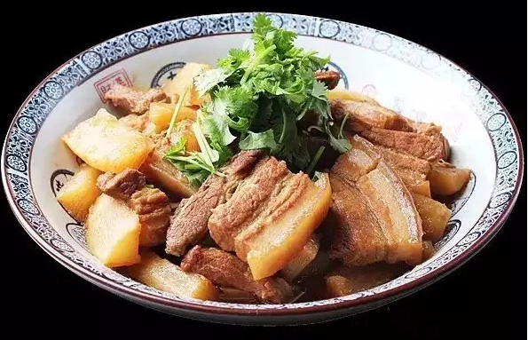 凈鍋里放油燒熱,下豬肉塊煸炒至吐油時(shí),下八角、草果、良姜等香料一同炒,摻清水燒開再加鹽和醬油,燒至豬肉熟時(shí),再把蘿卜塊加進(jìn)去同燒至軟熟,待用。