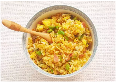 炒飯一定要用大火快速翻炒,不可炒太久,炒至熟就可出鍋,否則會出現水分越炒越少、飯越炒越干。特別是添加醬汁的炒飯,炒太干就無法達到豐盈濕潤的口感。而加入雞蛋的炒飯,蛋炒到半熟時就要加入米飯,炒后的飯上就會裹有一層金黃色。
