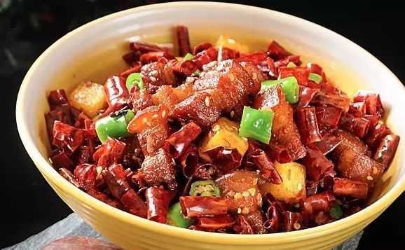 2.鍋留底油,投入干辣椒節(jié)、干花椒和洋蔥一起炒香后,下入炸過的紅燒肉和青紅椒圈,邊炒邊調(diào)入鹽、味精和雞精,起鍋盛入裝有土豆條的盤里,最后撒上蔥花即成。