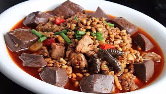這是四川眉山地區(qū)的一道民間菜,不僅是把土雞肉與雞血同烹成菜,而且在裝盤后,還要撒上已經(jīng)炸香的干豆子,這種成菜形式還比較少見。