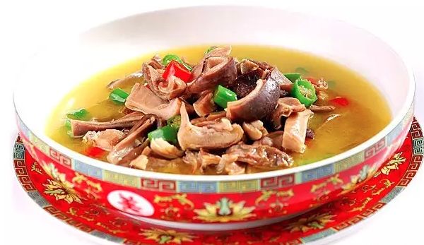 2.鍋內(nèi)放雞湯燒開,下海南燈籠辣椒醬、白醋、鹽和白糖調(diào)味并燒開,待煮出味后撈去醬渣,下入豬肚與青紅杭椒略煮,起鍋裝盤即成。
