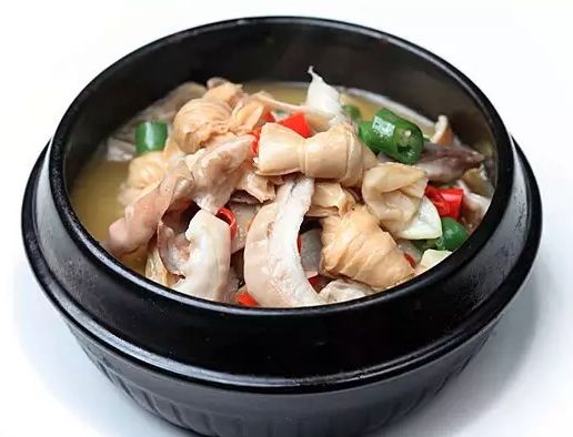 鍋里放化豬油燒熱,投入姜片和蒜片炒出香味后,摻入棒骨湯燒開,放入豬肚條和豆筋小火燉10分鐘,加鹽和雞精調(diào)味,出鍋前撒入青紅椒節(jié)便好。